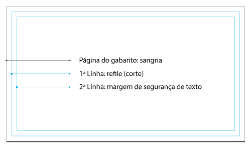 Observe que o gabarito contém duas linhas azuis dentro da página. De fora para dentro, o limite da página representa a sangria, em seguida a primeira linha azul representa onde o seu produto será refilado (cortado) e a última linha interna representa a margem de segurança de texto. Veja o exemplo abaixo: