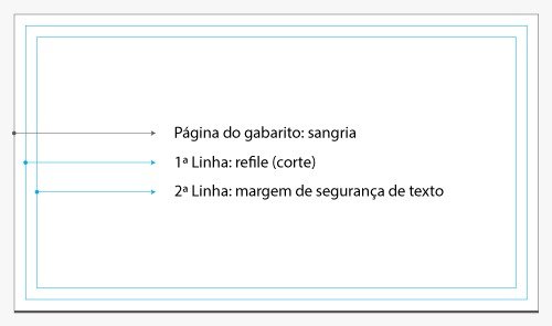 Abaixo observe que o gabarito contém duas linhas azuis dentro da página. De fora para dentro, o limite da página representa a sangria, em seguida a primeira linha azul representa onde o seu produto será refilado (cortado) e a última linha interna representa a margem de segurança de texto. Veja o exemplo abaixo: