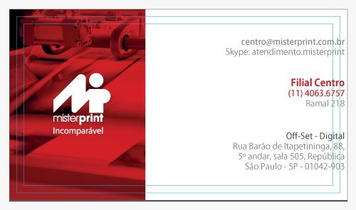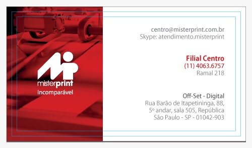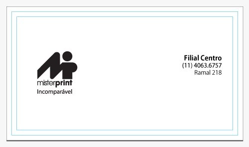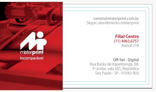A Mister Print não garante fidelidade de cores em nenhuma hipótese. Os impressos poderão apresentar variação de intensidade e tonalidade das cores, em relação ao monitor ou à prova impressa, bem como em relação às reimpressões, ou seja, poderá ocorrer variação para mais claro ou escuro, mais amarelado ou avermelhado, mais azulado ou arroxeado e apresentar leve variação de tonalidade entre os cartões do mesmo lote. Havendo necessidade de controle densitométrico em seus impressos [todos sempre com a mesma aproximação de cor], consulte o custo deste processo com nosso departamento comercial.