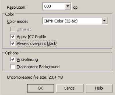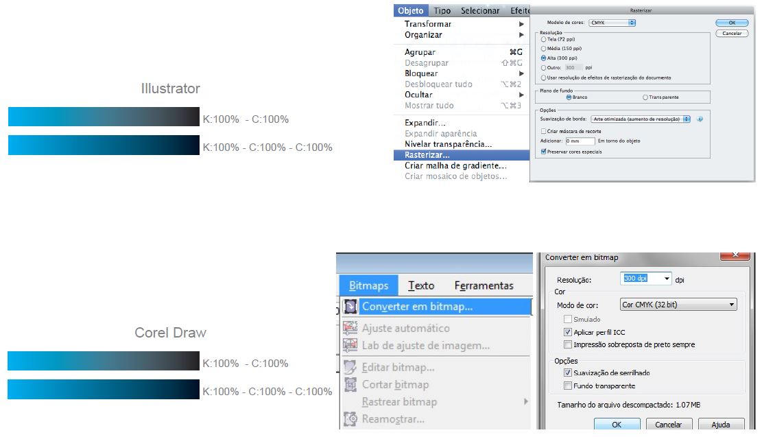 Recomendamos que se separe o texto (convertido em curvas) e agrupe o restante e converta o conteúdo do arquivo em um bitmap CMYK com 350dpi (digite a resolução desejada).