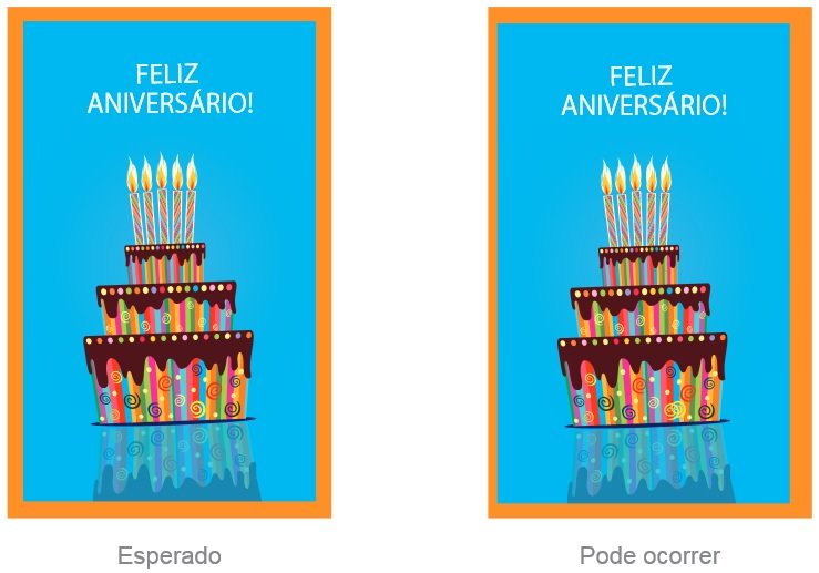 Abaixo vemos a diagramação errada, com certeza o texto será cortado e não será coberto pela garantia: