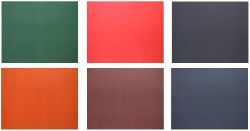 Veja abaixo a representação de uma variação de apenas 5% em cada cor sobre os quadros cinzas com a fórmula C:10% M:10%Y:10% K:10%