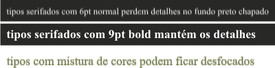 Texto branco sobre fundo chapado deverá ter o corpo BOLD (Negrito), com tamanho mínimo superior a 7 (sete) pontos, e sem serifa (aqueles pequenos detalhes nas pontas das letras como a Times), pois se os traços da letra estiverem muito finos, poderão perder definição. Variação de registro em arquivos enviados com corpo de texto inferior a 7 (sete) pontos são comuns e não são considerados como defeitos de impressão, principalmente quando o texto é com mistura de cores. Nunca utilize preto 4 cores (C:100% M:100% Y:100% K:100%) para texto, independente do tamanho, pois certamente apresentará variação de registro.